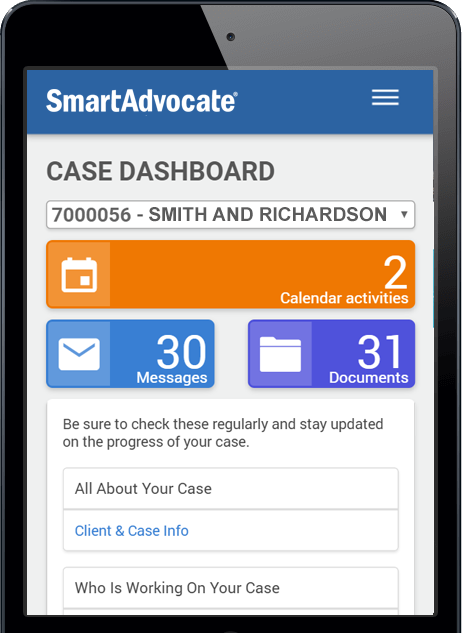 WorkPlans and Automated Procedures along with SmartAdvocate’s built-in Dashboards and Reports allow a firm to easily track each step of a case’s progression. Our software can show what has been accomplished and what still needs to be done, and it can also keep track of a lot of important details that might be needed for a case. For instance, it can tell you the last time that a client was contacted and keep tabs on a client’s diagnosis and severity of injuries. Another valuable tool that can help with case tracking is the SmartAdvocate App, which allows you to have access to all of your cases on the go. Whether an attorney is in court or out of the office, if they need to access documents or check the status of a case, they can get the information they need in seconds. SmartAdvocate doesn’t just help law firms keep track of cases: It helps their clients, too. In the Client Portal, you can give your clients access so that they can see information about their case, important documents, calendar entries, and notes. This frees your firm’s staff from needing to answer phone calls from clients who have questions about the status of their case: The clients can go into the portal and see the answers for themselves.